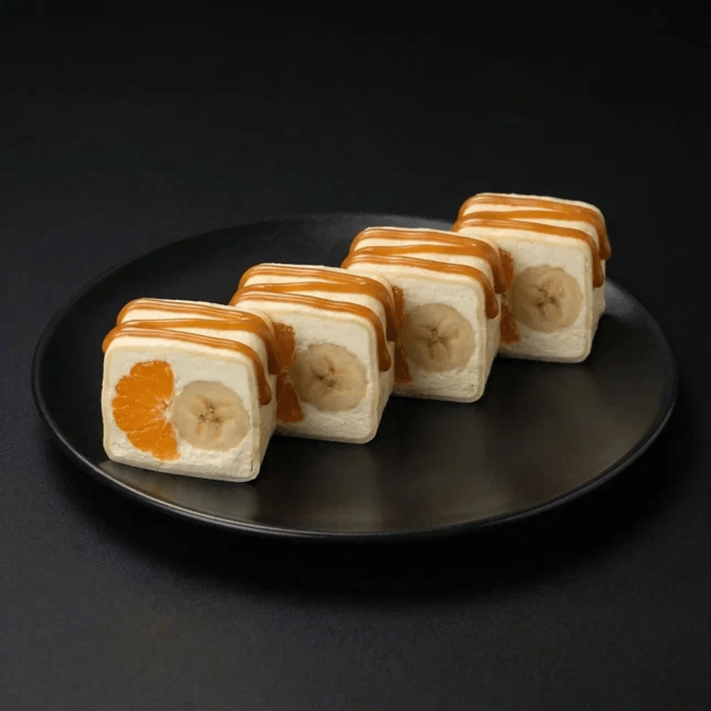 Спринг тесто, сыр Cremette, мандарин, банан, сахарная пудра, карамельный топпинг