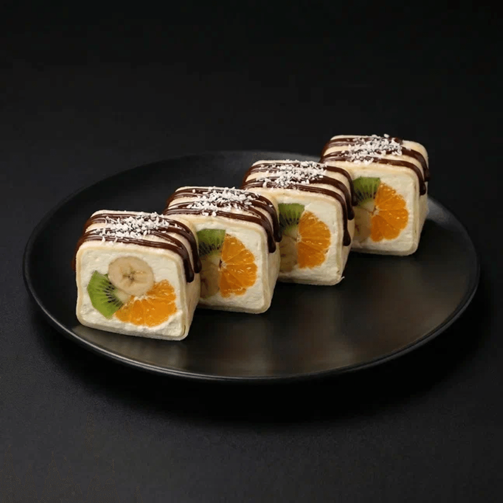Сыр Cremette, спринг-тесто, банан, апельсин, киви, кокосовая стружка, сахарная пудра, шоколадный топпинг