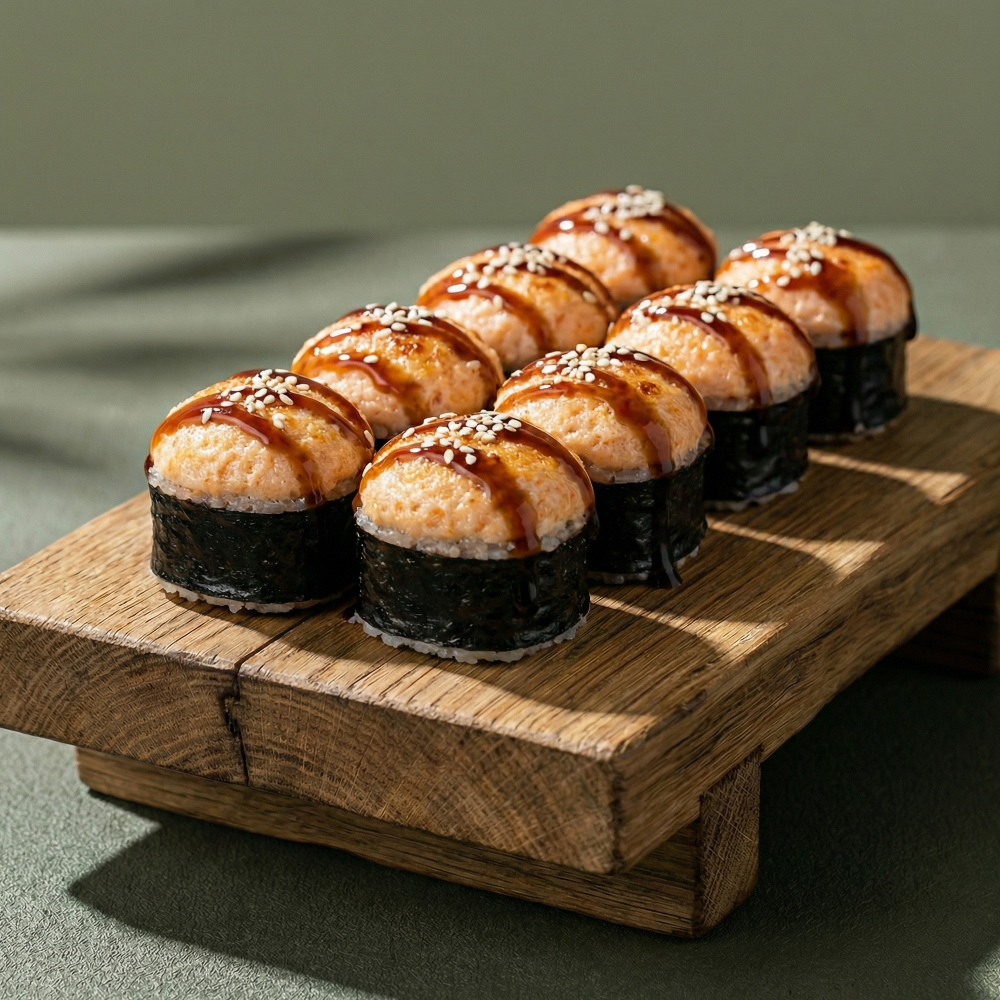 Рис, нори, курица, соус яки, соус унаги, кунжут