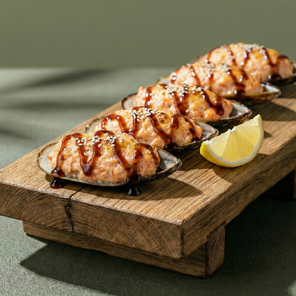 Мидии гигант, соус яки, соус унаги, кунжут, лимон (5 шт.)