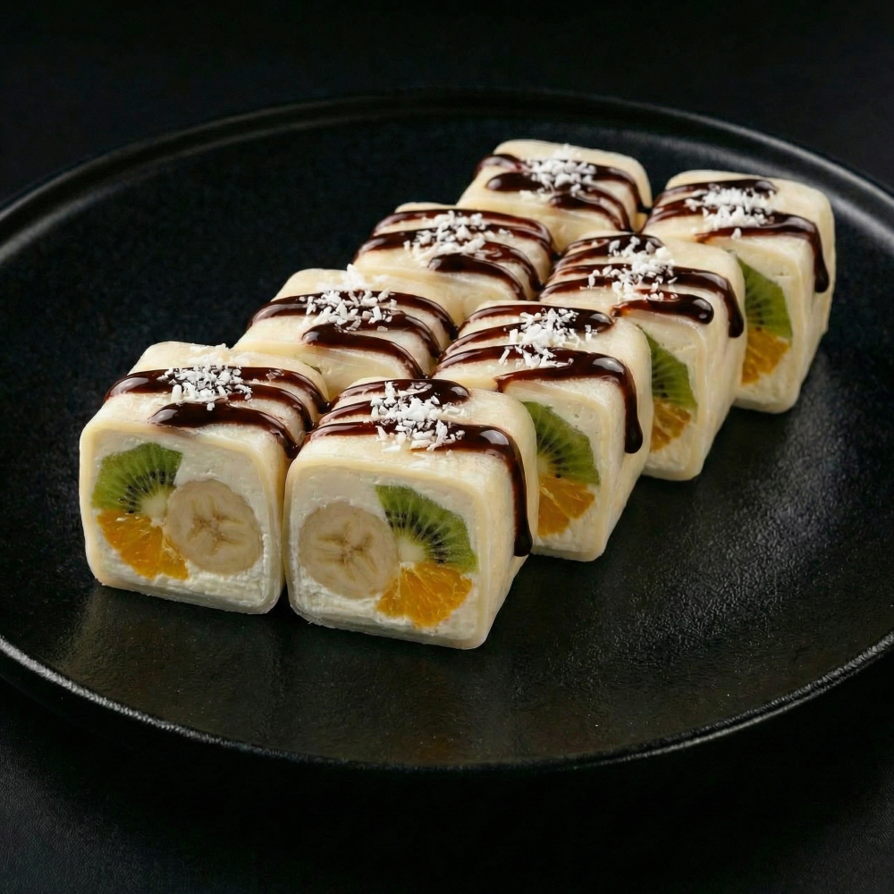 Сыр Cremette, спринг-тесто, банан, апельсин, киви, кокосовая стружка, сахарная пудра, шоколадный топпинг