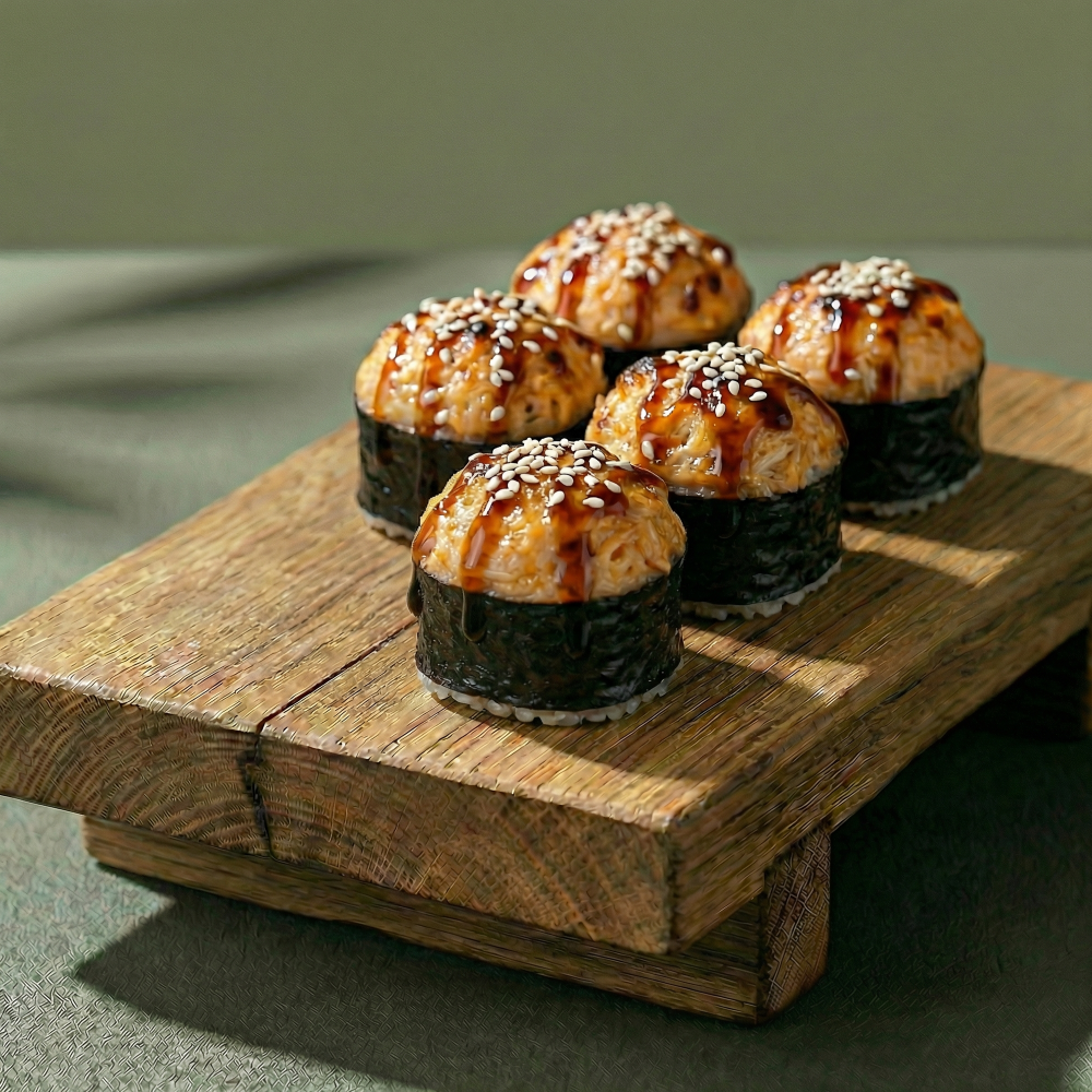 Рис, нори, снежный краб, омлет, соус яки, соус сырный, соус унаги, кунжут