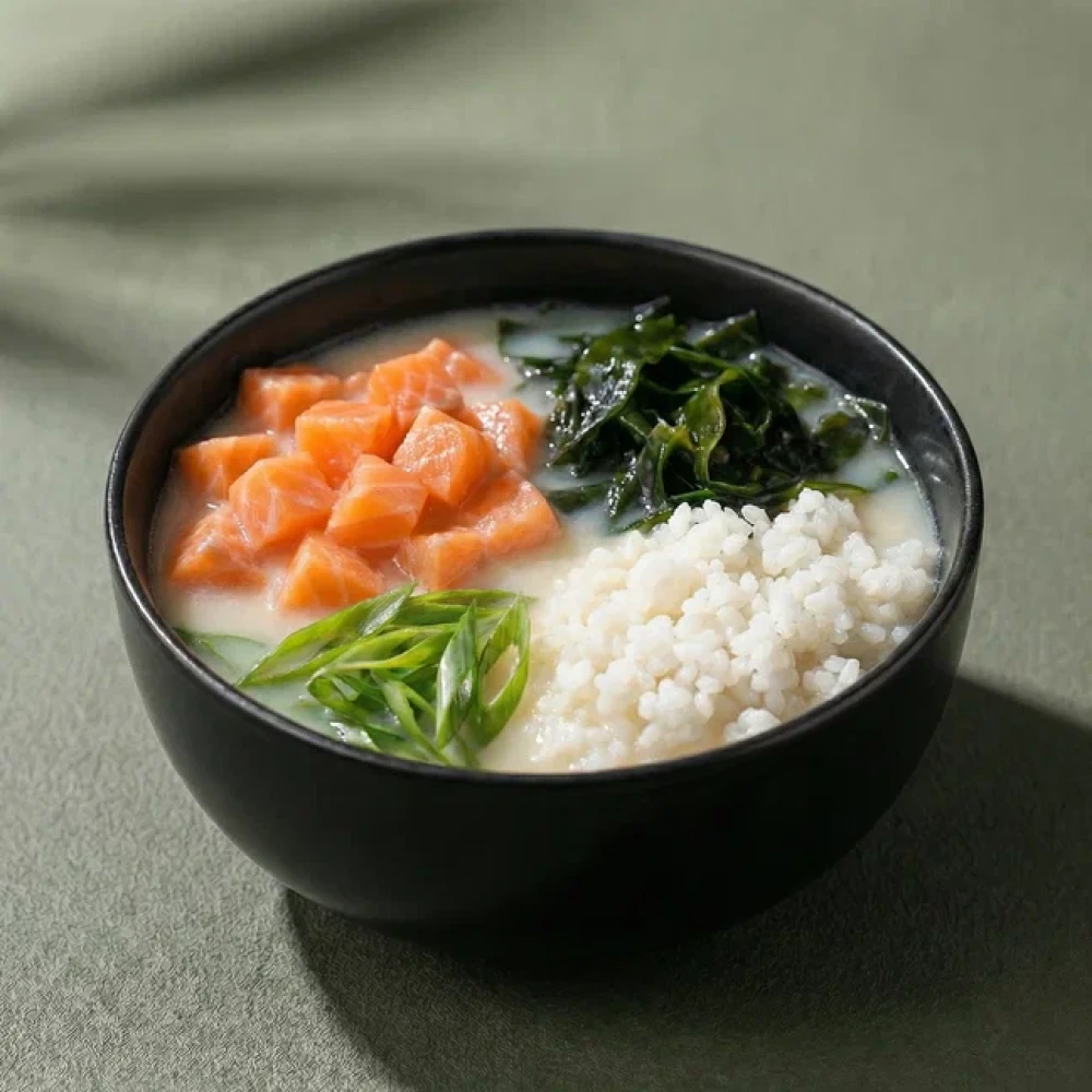 Бульон сливочный, соус соевый, кунжут, рис, хондаши, красная рыба, вакаме, зеленый лук