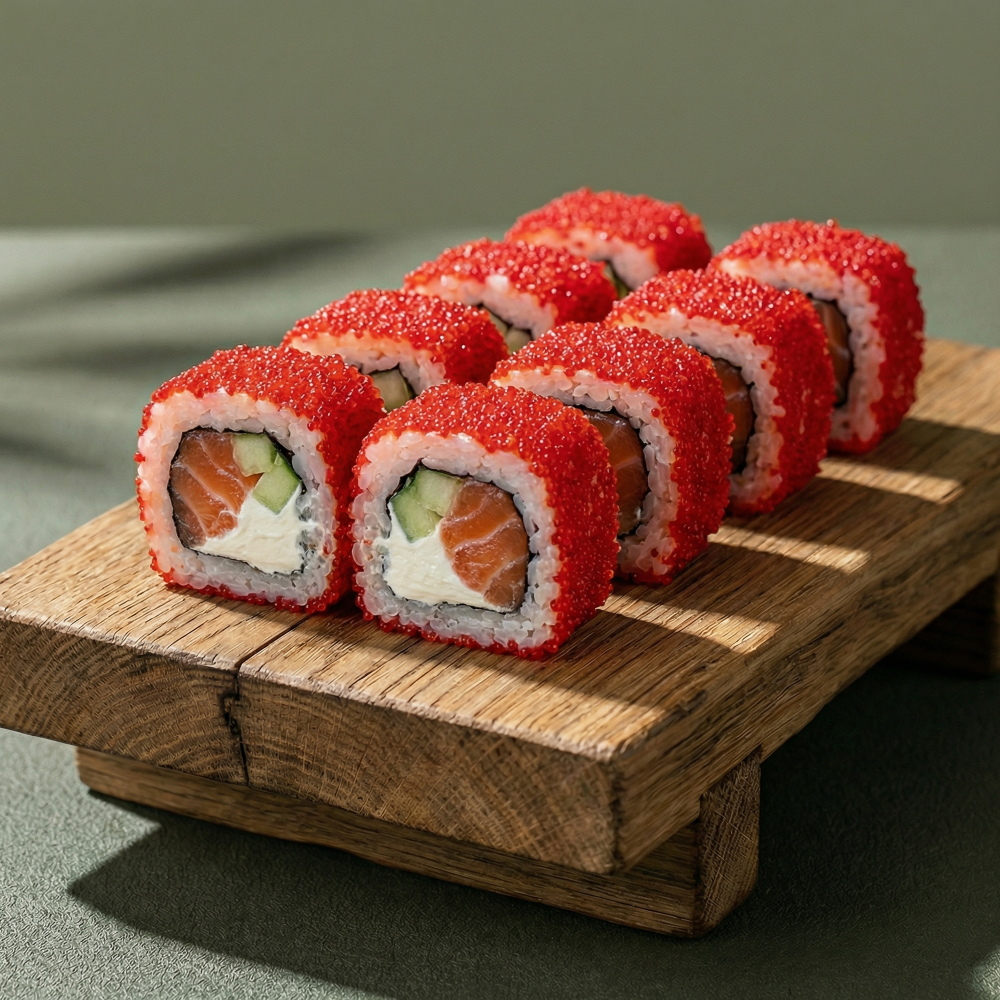 Рис, нори, сыр Cremette, огурец, красная рыба, масаго красная