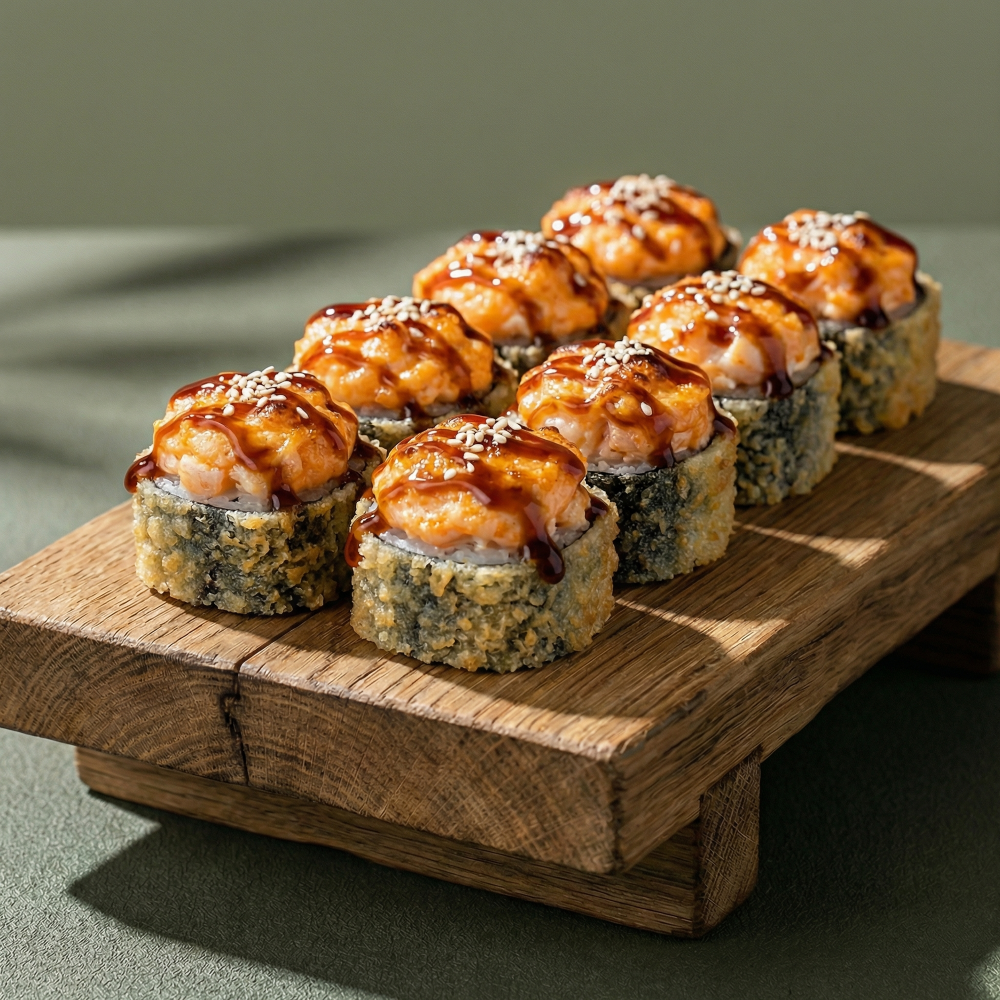 Рис, нори, огурец, авокадо, снежный краб, креветка, кляр, сухари панировочные, соус спайси, соус унаги, кунжут