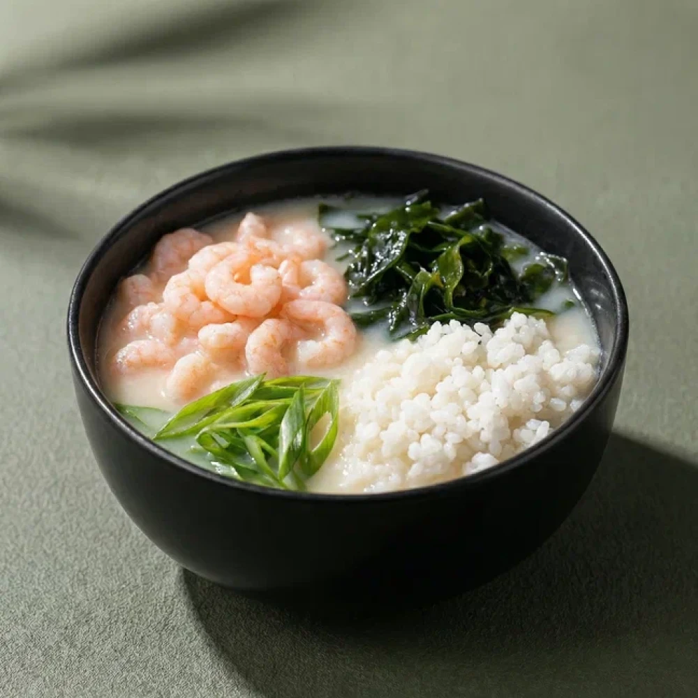 Бульон сливочный, соус соевый, кунжут, рис, хондаши, креветка, вакаме, зеленый лук