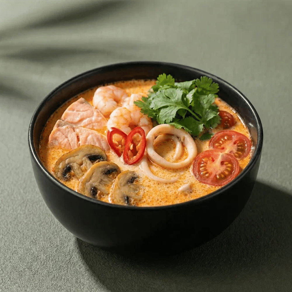 Бульон том-кха, креветка тигровая, шампиньоны, кальмар, красная рыба, лук репчатый, помидор черри, перец чили, кинза, рис отварной, кунжут, лимон