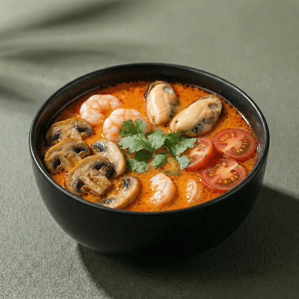 Бульон том ям, грибы вешенки, шампиньоны, мидии гигант, креветка тигровая, помидор черри, паста Том ям, рис отварной, кунжут, лимон