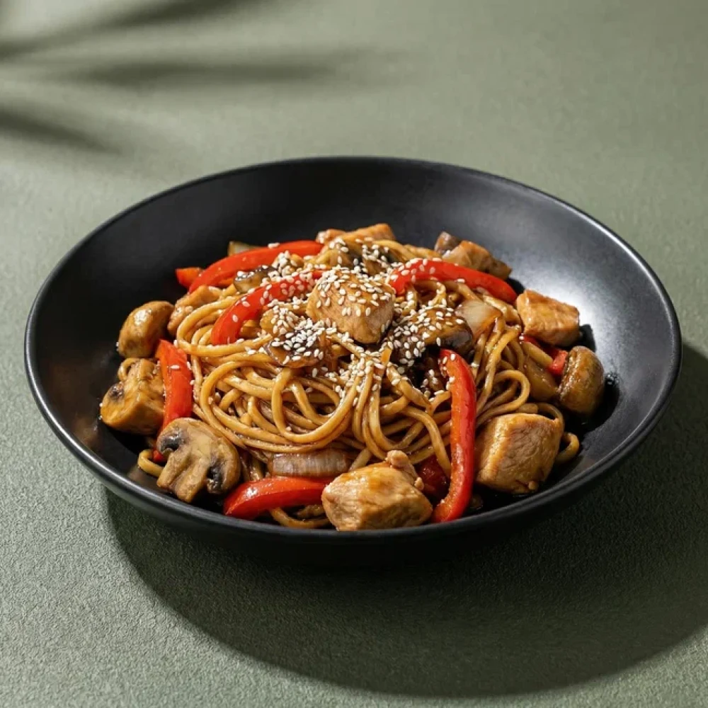 Лапша, курица, имбирь, лук репчатый, болгарский перец, шампиньоны, соус соевый, соус терияки, имбирь, чеснок, кунжут, зеленый лук
