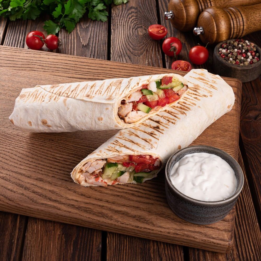 Хрустящий лаваш, сочное куриное филе приготовленное на мангале, Фирменный соус, свежий огурец, помидоры,красный лучок и соус тар-тар.