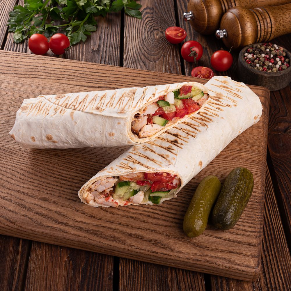 Хрустящий лаваш, сочное куриное филе приготовленное на мангале, вкусный маринованный огурчик, Фирменный соус, свежий огурец, помидоры и красный лучок