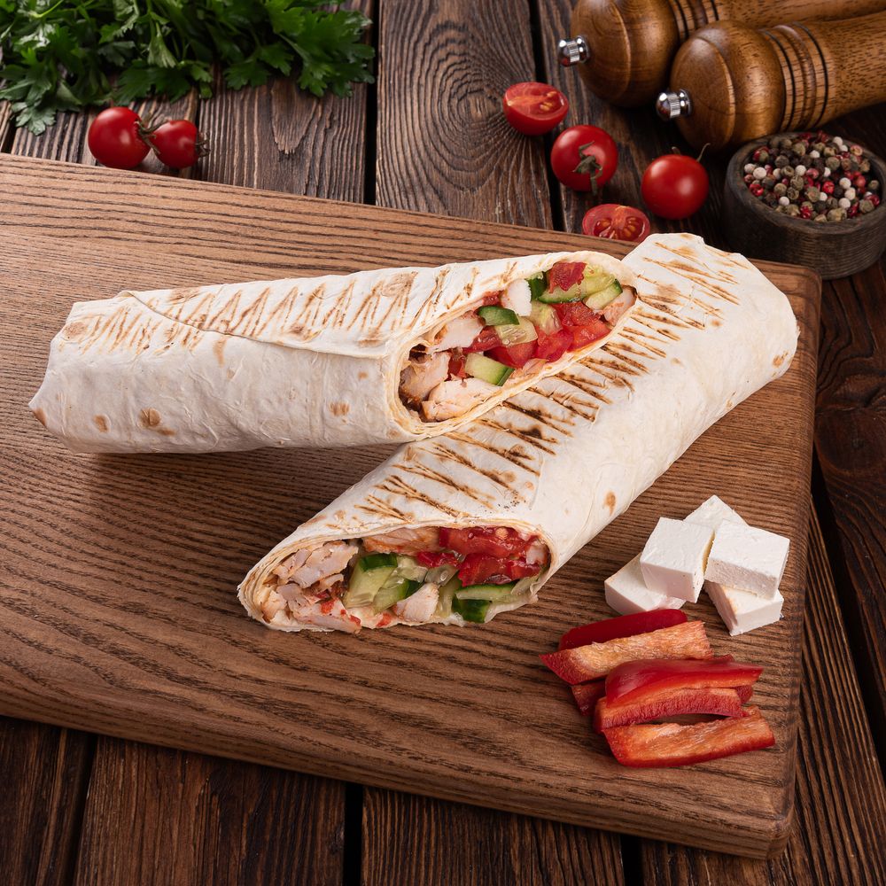 Хрустящий лаваш, обжаренное на огне сочное куриное филе, ароматный греческий сыр Фета, Фирменный соус, свежий огурец, помидоры, болгарский перец и красный лучок.