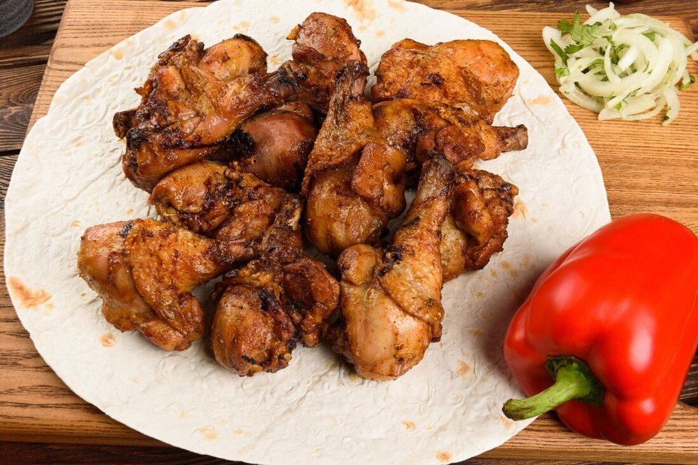 1 кг сочных куриных ножек в фирменном маринаде. Подаётся с луком.