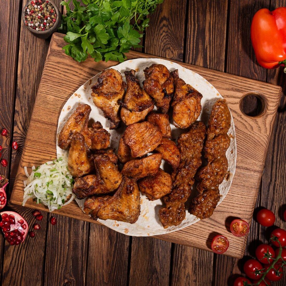 Шашлык из куриной грудки (240 г), шашлык из куриных крылышек (290 г), шашлык из куриных ножек (300 г), люля-кебаб из курицы (270 г)
