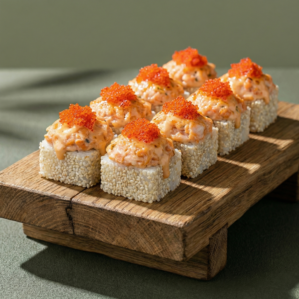 Рис, нори, кунжут, сыр Cremette, снежный краб, креветка, соус яки, соус тайский, масаго