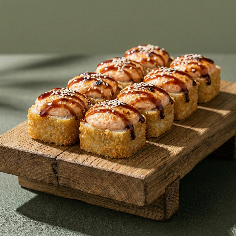 Рис, спринг-тесто, сыр Cremette, омлет, окунь, кляр, сухари панировочные, соус яки, соус унаги, кунжут