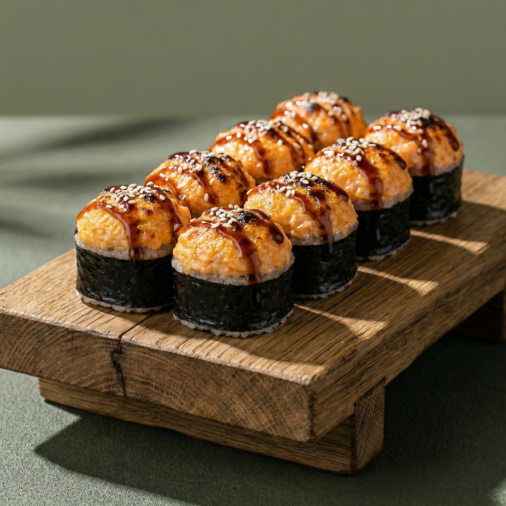 Рис, нори, курица, соус спайси, соус унаги, кунжут
