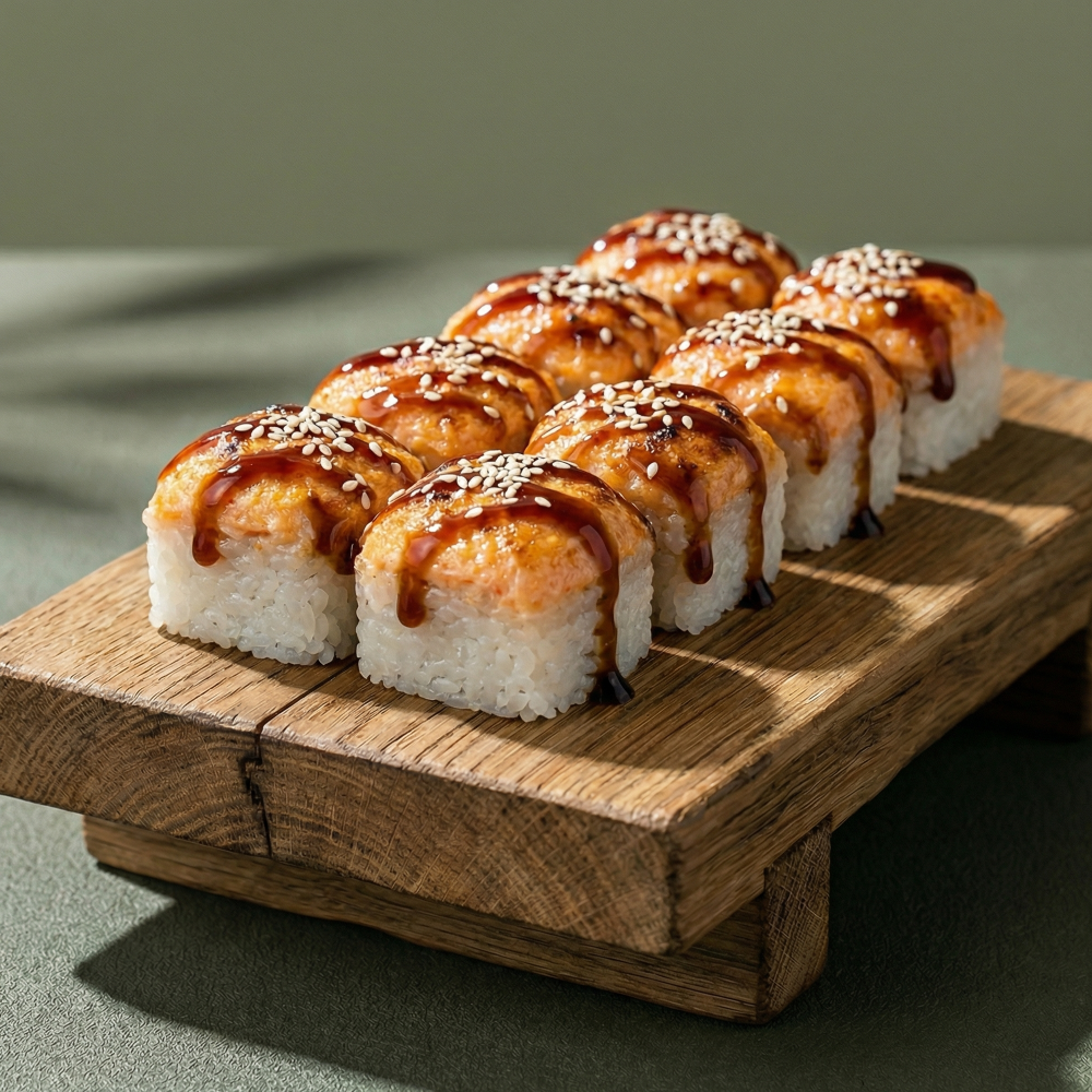 Рис, нори, сыр Cremette, курица, салат айсберг, сыр Пармезан, соус яки, соус унаги