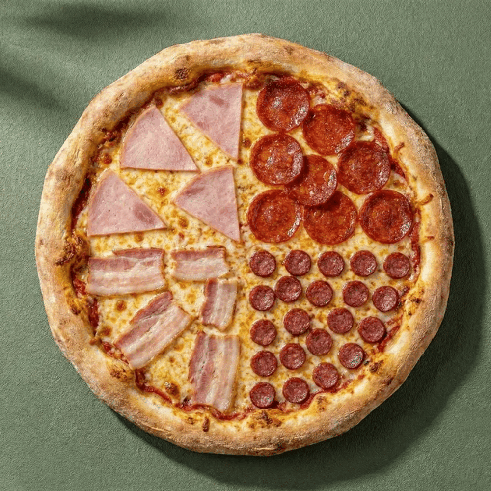 Тесто, соус томатный, сыр Моцарелла, охотничьи колбаски, пеперони, ветчина, бекон
