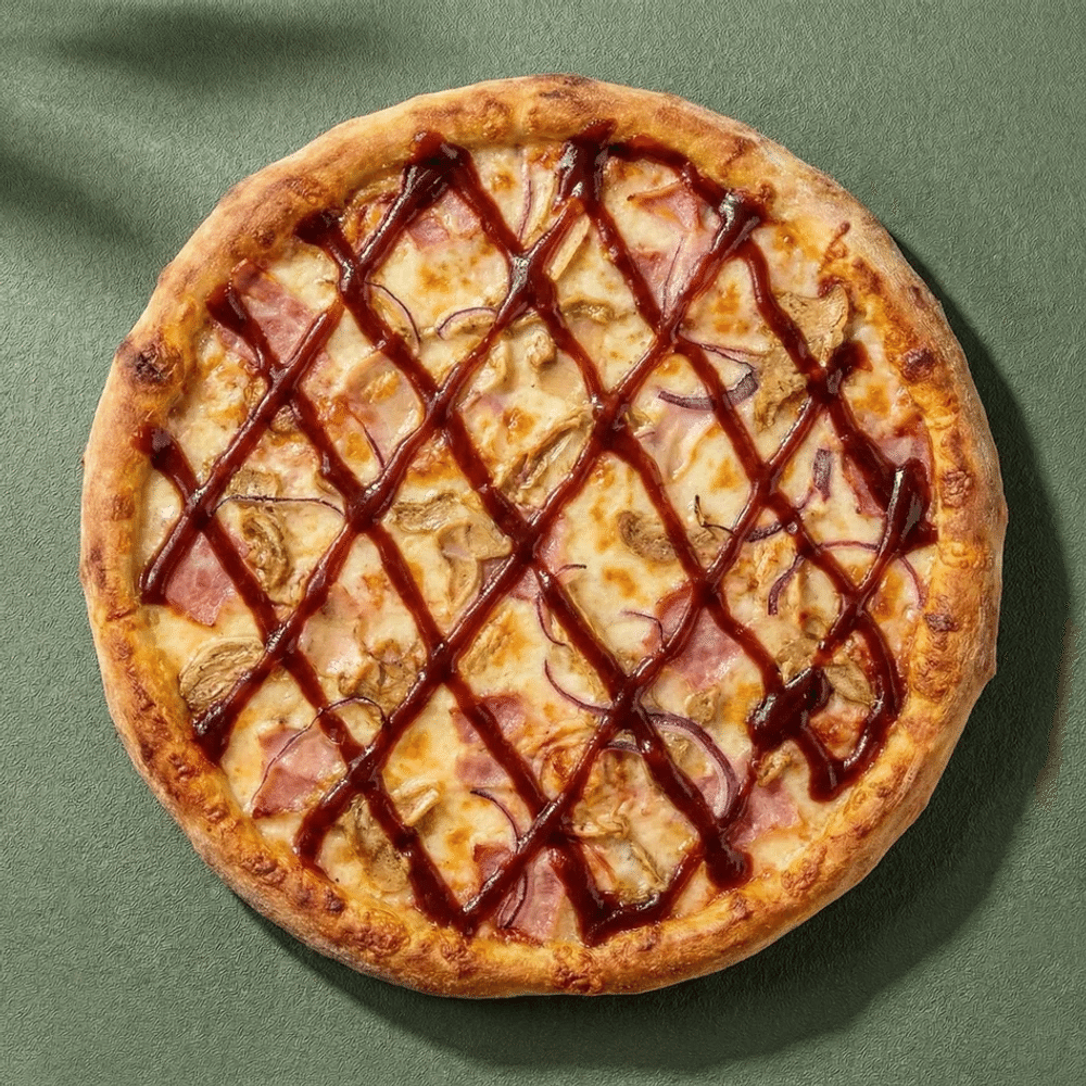 Тесто, соус томатный, бекон, курица в маринаде, лук красный, сыр Моцарелла, соус барбекю