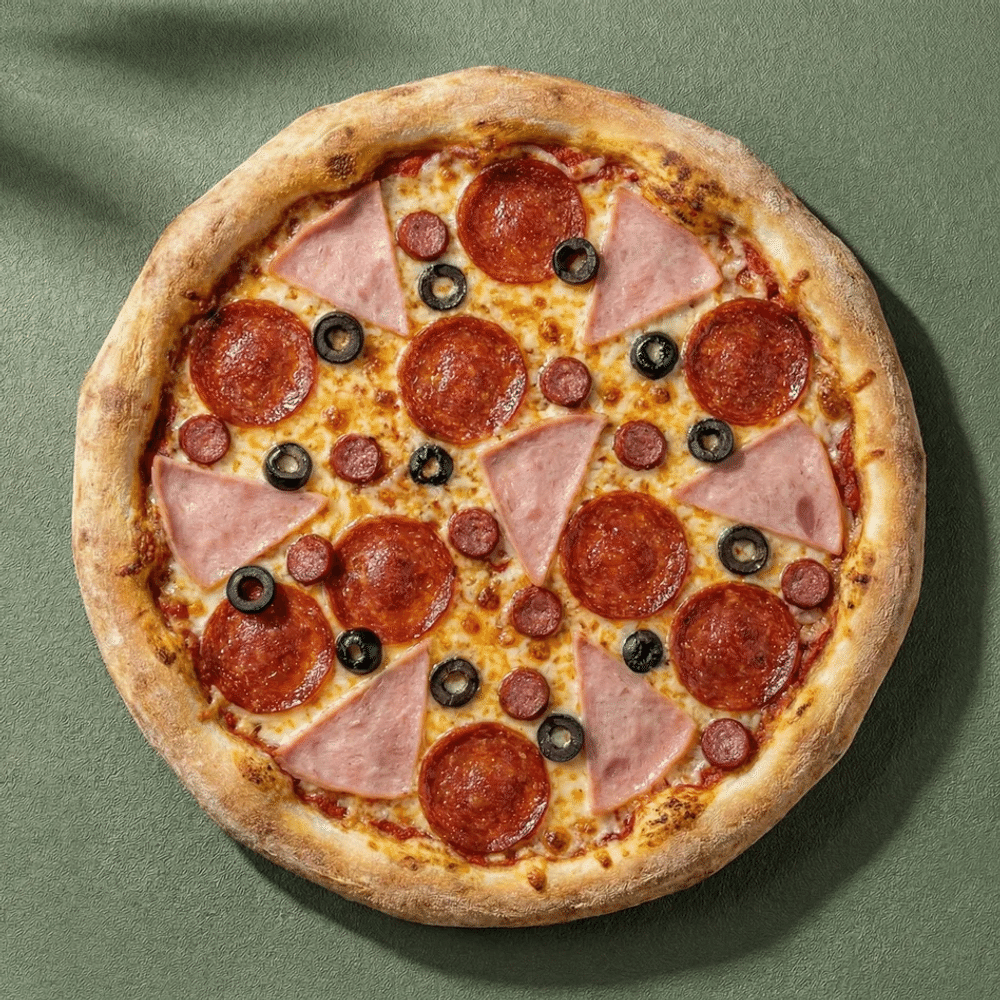 Тесто, соус томатный, сыр Моцарелла, ветчина, пеперони, охотничьи колбаски, маслины