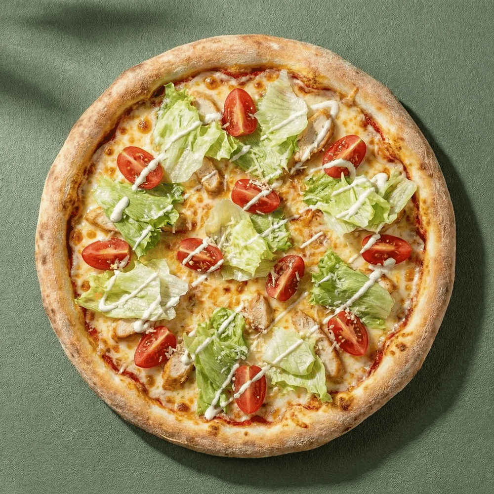 Тесто, соус цезарь, сыр Моцарелла, курица в маринаде, помидор черри, салат айсберг, сыр Пармезан