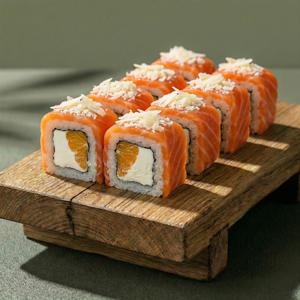 Рис, нори, красная рыба, мандарин, сыр Cremette, пармезан