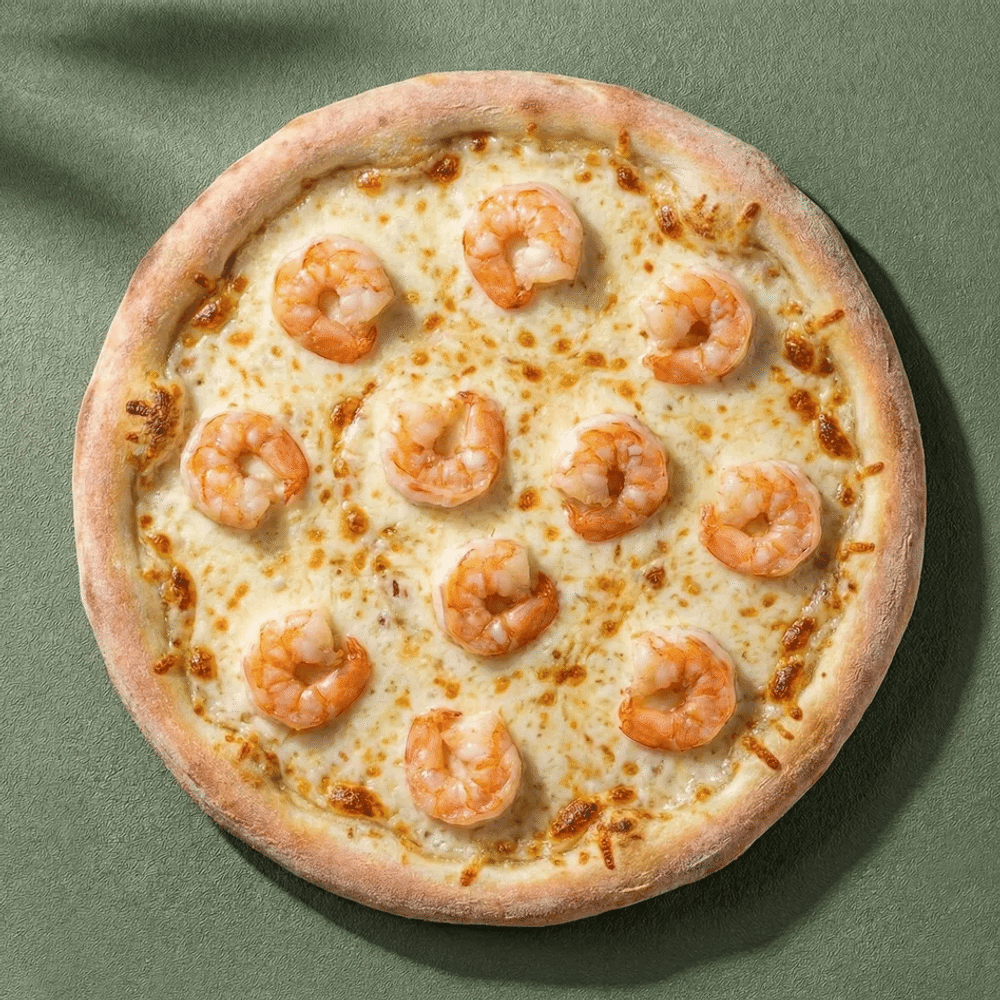 Тесто, соус с шафраном, сыр Моцарелла, тигровые креветки