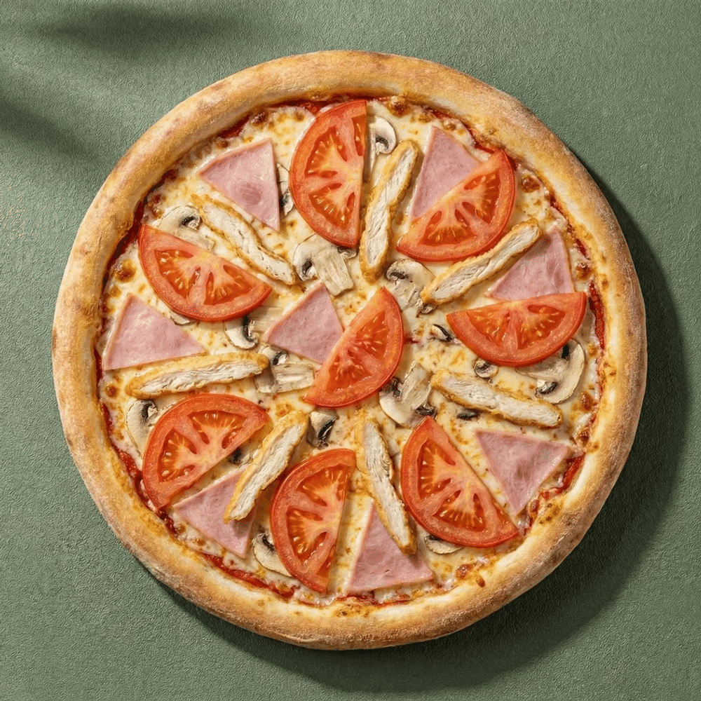 Тесто, соус томатный, сыр Моцарелла, ветчина, шампиньоны, курица в маринаде, помидоры