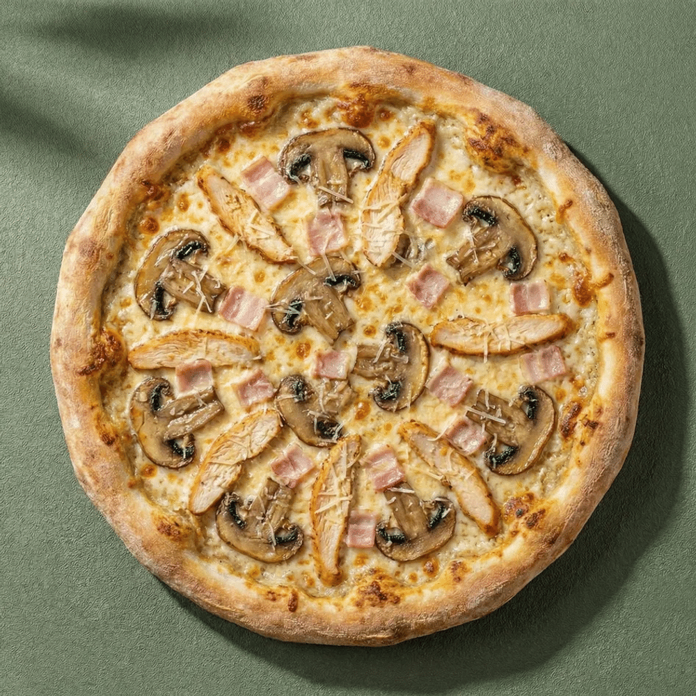Тесто, соус сливочный, сыр Моцарелла, бекон, курица в маринаде, шампиньоны, сыр Пармезан