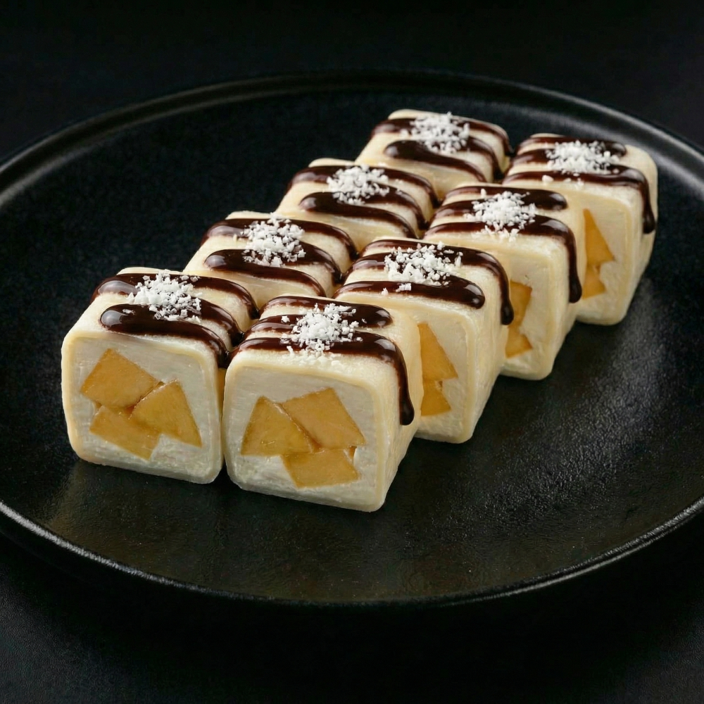 Спринг тесто, сыр Cremette, манго, сахарная пудра, шоколадный топпинг, кокосовая стружка