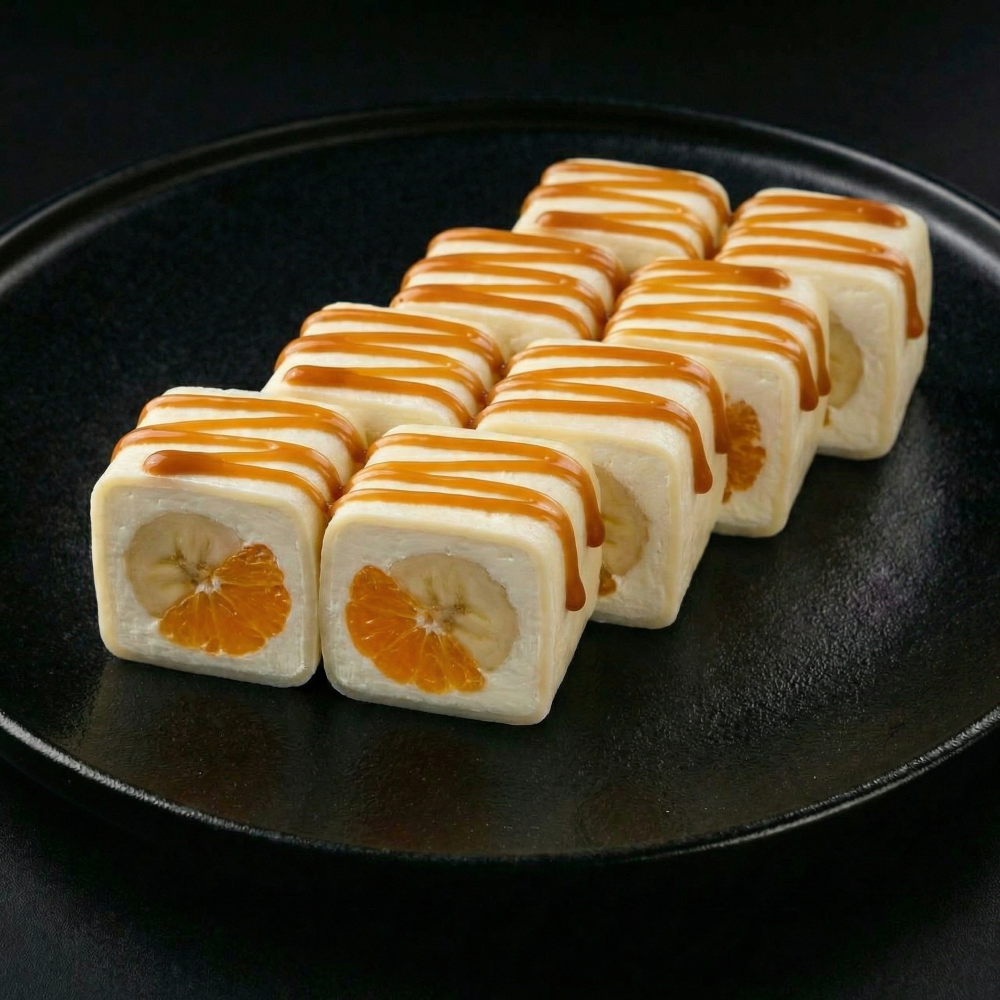 Спринг тесто, сыр Cremette, мандарин, банан, сахарная пудра, карамельный топпинг