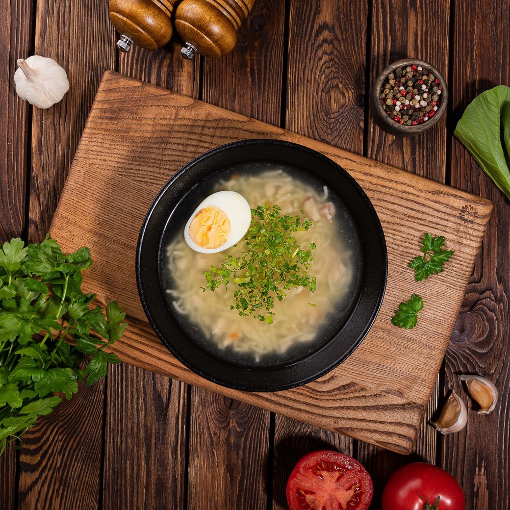 Бульон, куриное филе, вермишель,зелень,яйцо.