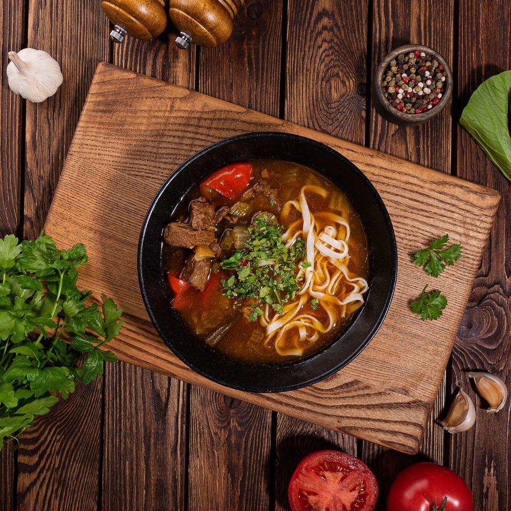 Лапша собственного приготовления, мясо говядины, помидор, болгарский перец, лук,чеснок,капуста пекинская, фасоль стручковая, сельдерей,зелень, специи.