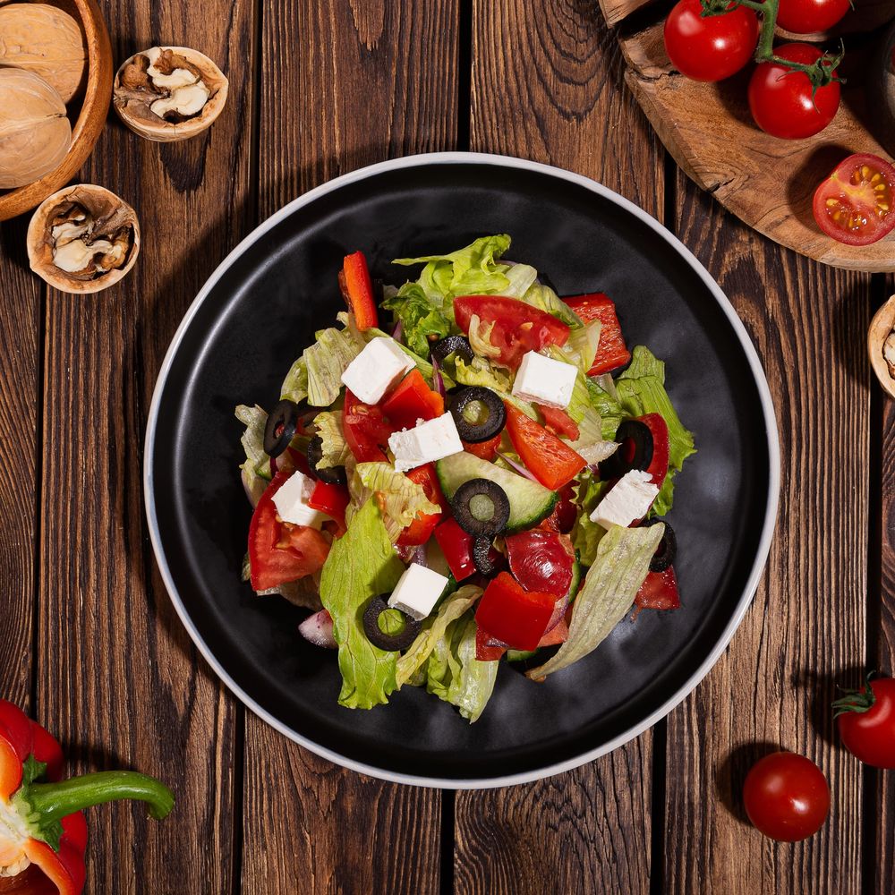 Помидоры, огурцы, перец болгарский, салат айсберг, маслины, лук репчатый, сыр фета.