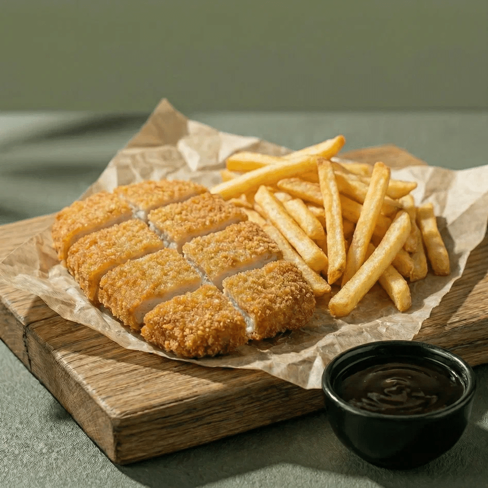 Курица в кляре, картофель фри
